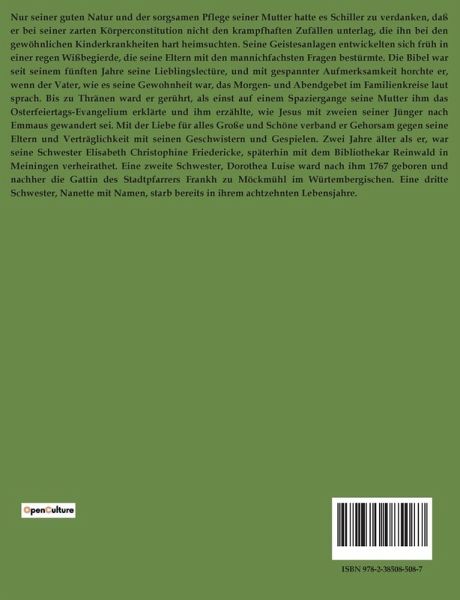 Nur seiner guten Natur und der sorgsamen Pflege seiner Mutter hatte es Schiller zu verdanken, daß er bei seiner zarten Körperconstitution nicht den krampfhaften Zufällen unterlag, die ihn bei den gewöhnlichen Kinderkrankheiten hart heimsuchten. Seine Geistesanlagen entwickelten sich früh in einer regen Wißbegierde, die seine Eltern mit den mannichfachsten Fragen bestürmte. Die Bibel war seit seinem fünften Jahre seine Lieblingslectüre, und mit gespannter Aufmerksamkeit horchte er, wenn der Vater, wie es seine Gewohnheit war, das Morgen- und Abendgebet im Familienkreise laut sprach. Bis zu…mehr