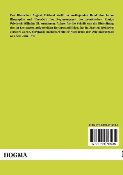 Der Historiker August Potthast stellt im vorliegenden Band eine kurze Biographie und Übersicht der Regierungszeit des preußischen Königs Friedrich Wilhelm III. zusammen. Anlass für die Schrift war die Einweihung des im Lustgarten aufgestellten Reiterstandbildes, das im Zweiten Weltkrieg zerstört wurde. Sorgfältig nachbearbeiteter Nachdruck der Originalausgabe aus dem Jahr 1871.