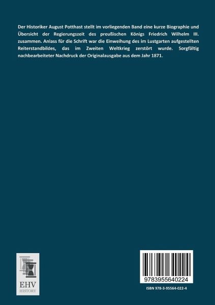 Der Historiker August Potthast stellt im vorliegenden Band eine kurze Biographie und Übersicht der Regierungszeit des preußischen Königs Friedrich Wilhelm III. zusammen. Anlass für die Schrift war die Einweihung des im Lustgarten aufgestellten Reiterstandbildes, das im Zweiten Weltkrieg zerstört wurde. Sorgfältig nachbearbeiteter Nachdruck der Originalausgabe aus dem Jahr 1871.