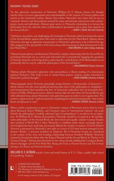 By subjecting Nietzsche to a Platonic critique, author William H. F. Altman punctures his "pose of untimeliness" while making use of Nietzsche’s own aphoristic style of presentation. Friedrich Wilhelm Nietzsche—named for a Prussian King—is thereby revealed to be the representative philosopher of the Second Reich.