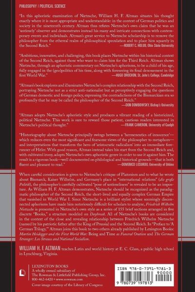 By subjecting Nietzsche to a Platonic critique, author William H. F. Altman punctures his "pose of untimeliness" while making use of Nietzsche’s own aphoristic style of presentation. Friedrich Wilhelm Nietzsche—named for a Prussian King—is thereby revealed to be the representative philosopher of the Second Reich.