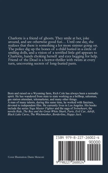 Charlotte is a friend of ghosts. They smile at her, joke around, and are otherwise good fun... Until one day, she realizes that there is something a lot more sinister going on. The police dig up the bones of a child buried in a circle of smiling dolls, and a vision of a terrified little girl appears to Charlotte, hands choking herself and eyes begging for help. Friend of the Dead is a horror-thriller with twists at every turn, uncovering secrets of long-buried pasts.