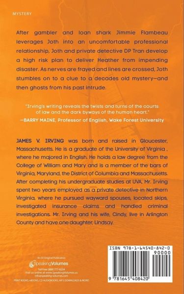 After gambler and loan shark Jimmie Flambeau leverages Joth into an uncomfortable professional relationship, Joth and private detective DP Tran develop a high risk plan to deliver Heather from impending disaster. As nerves are frayed and lines are crossed, Joth stumbles on to a clue to a decades old mystery-and then ghosts from his past intrude. "Irving's writing reveals the twists and turns of thecourts of law and the dark byways of the human heart."-Barry Maine, Professor of English, Wake Forest University
