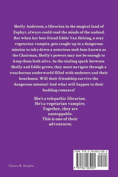 Shelly Anderson, a librarian in the magical land of Zephyr, has always had the ability to read the minds of the undead. But when her best friend Eddie Van Helsing, a sexy vegetarian vampire, gets caught up in a dangerous mission to take down a notorious mob boss known as the Chairman, Shelly's powers may not be enough to keep them both alive. As the sizzling spark between Shelly and Eddie grows, they must navigate through a treacherous underworld filled with mobsters and their henchmen. Will their friendship survive the dangerous mission? And what will happen to their budding romance?