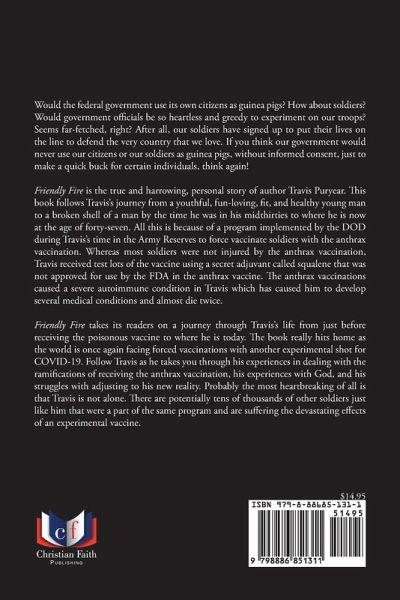 Would the federal government use its own citizens as guinea pigs? How about soldiers? Would government officials be so heartless and greedy to experiment on our troops? Seems far-fetched, right? After all, our soldiers have signed up to put their lives on the line to defend the very country that we love. If you think our government would never use our citizens or our soldiers as guinea pigs, without informed consent, just to make a quick buck for certain individuals, think again! Friendly Fire is the true and harrowing, personal story of author Travis Puryear. This book follows Travis's journey from a youthful, fun-loving, fit, and healthy young man to a broken shell of a man by the time he was in his midthirties to where he is now at the age of forty-seven. All this is because of a program implemented by the DOD during Travis's time in the Army Reserves to force vaccinate soldiers with the anthrax vaccination. Whereas most soldiers were not injured by the anthrax vaccination, Travis received test lots of the vaccine using a secret adjuvant called squalene that was not approved for use by the FDA in the anthrax vaccine. The anthrax vaccinations caused a severe autoimmune condition in Travis which has caused him to develop several medical conditions and almost die twice. Friendly Fire takes its readers on a journey through Travis's life from just before receiving the poisonous vaccine to where he is today. The book really hits home as the world is once again facing forced vaccinations with another experimental shot for COVID-19. Follow Travis as he takes you through his experiences in dealing with the ramifications of receiving the anthrax vaccination, his experiences with God, and his struggles with adjusting to his new reality. Probably the most heartbreaking of all is that Travis is not alone. There are potentially tens of thousands of other soldiers just like him that were a part of the same program and are suffering the devastating effects of an experimental vaccine.