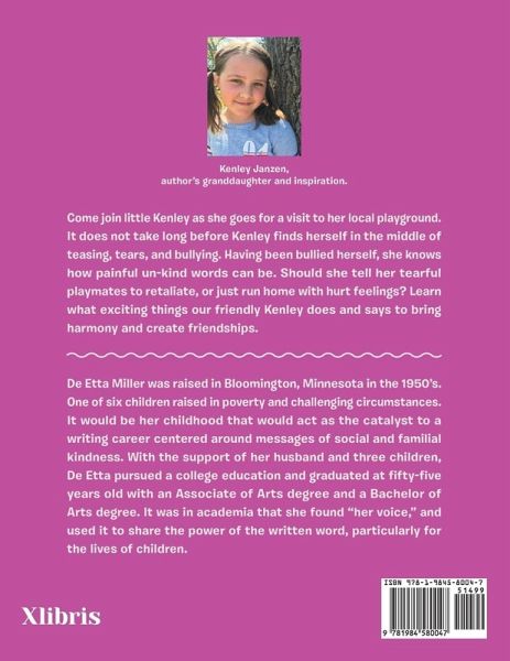 Come join little Kenley as she goes for a visit to her local playground. It does not take long before Kenley finds herself in the middle of teasing, tears, and bullying. Having been bullied herself, she knows how painful un-kind words can be. Should she tell her tearful playmates to retaliate, or just run home with hurt feelings? Learn what exciting things our friendly Kenley does and says to bring harmony and create friendships.