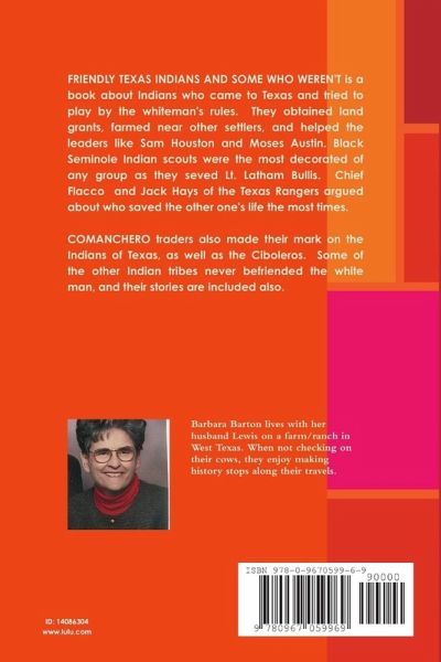 Friendly Texas Indians describes individuals who tried to help the young Texas country as settlers arrived from the east. Chiefs Flacco, Placido,and John Gopher were great scouts who helped men like Texas Ranger Jack Hays and Col. Ranald McKenzie fight the agressive tribes. Black Seminole scouts won many medals of honor. Jumano Indians were a gentle, kind group who helped the Spanish explorers as they made their first trip through Texas. The climax account of each of these Texas tribes is a riveting story.