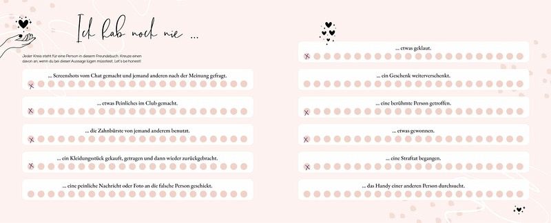 Trendiger Look mit hochwertiger Goldfolienveredlung auf dem CoverSteckbriefseiten in unterschiedlichen Designs mit viel Platz für Einträge und FotosMit tollen Extras und Mitmachseiten für die #calicrew - Geburtstagskalender, Ich-hab-noch-nie und Platz für gemeinsame ErinnerungenTolles Extra: Persönlicher Steckbrief von Kessy
