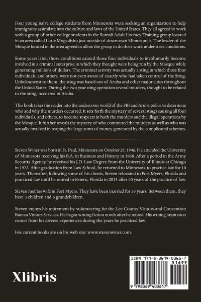 Four young and naïve college students from Minnesota were seeking an organization to help immigrants assimilate into the culture and laws of the United States. They all agreed to work with a group of other college students in the Somali Adult Literacy Training group located in an area called Little Mogadishu just outside of downtown Minneapolis. The leader of the Mosque located in the area agreed to allow the group to do their work under strict conditions. Some years later, those conditions caused those four individuals to involuntarily become involved in a criminal enterprise in which they thought were being run by the Mosque while generating millions of dollars. The criminal activity was actually a sting in which those four individuals, and others, were not even aware of exactly who had taken control of the Sting. Unbeknownst to them, the sting was based out of Aruba and other major cities throughout the United States. During the two year sting operation several murders, thought to be related to the sting, occurred in Aruba. This book takes the reader into the undercover world of the FBI and Aruba police to determine who and why the murders occurred. It sets forth the mystery of several stings causing all four individuals, and others, to become suspects in both the murders and the illegal operations by the Mosque. It further reveals the mystery of who committed the murders as well as who was actually involved in reaping the large sums of money generated by the complicated schemes.