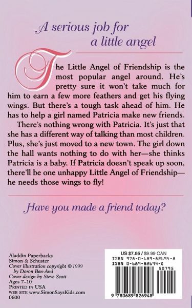 Every time a bell rings, an angel gets his wings. The Little Angel of Friendship is the most popular angel around. He's pretty sure it won't take much for him to earn a few more feathers and get his flying wings. But there's a tough task ahead of him. He has to help a girl named Patricia make new friends. There's nothing wrong with Patricia. It's just that she has a different way of talking than most children. Plus, she's just moved to a new town. The girl down the hall wants nothing to do with her -- she thinks Patricia is a baby. If Patricia doesn't speak up soon, there'll be one unhappy Little Angel of Friendship -- he needs those wings to fly! Have you made a friend today?