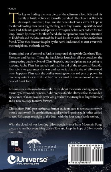 The key to finding the next piece of the talisman is lost. Rift and his family of battle wolves are formally banished. The church at Brittle is destroyed. Guntharr, Taya, and the others look for a sliver of hope as the thread holding their quest together begins to fray. Raskin, Taya's life-bound hawk lord, falls into guilt and depression over a past he has kept hidden for too long. Driven by concern for their friend, the companions turn their attention to Eddiforth and the Mountain of the Hawk Lords to seek resolution for their friend. What they discover is a plot by the hawk lord council to start a war with their neighbors, the battle wolves. Events spiral out of control as Raskin is captured along with Guntharr, Taya, Firebane, and Farrian. The alpha hawk lords launch an all-out attack on the unsuspecting battle wolves of Clan Firepack, but the alphas are not going to it alone. Alpha Plass has secretly enlisted the aid of the sorceress, Naranda. Her role is to guarantee the war and see to it that the rise of Silverwood never happens. Plass seals the deal by turning over the red gem of power. Its discovery coincides with the alphas' orchestrated extermination of a certain caste of hawk lords. Tensions rise as Raskin discovers the truth about the events leading up to his rescue by Silverwood's princess. As he prepares for the ultimate fate, the sudden appearance of an impossible hawk lord gives him the strength to forgive himself and a new courage to move forward. Ghosts from Rift's past surface as former students seek to settle a score with the old battle wolf. To save his friends and lay the lingering guilt he has carried to rest, Rift agrees to a fight to the death with the four rogue battle wolves. With the clouds of war looming, Silverwood's friends from Mountain Forge prepare to sacrifice everything to save Taya and keep the hope of Silverwood's return alive.