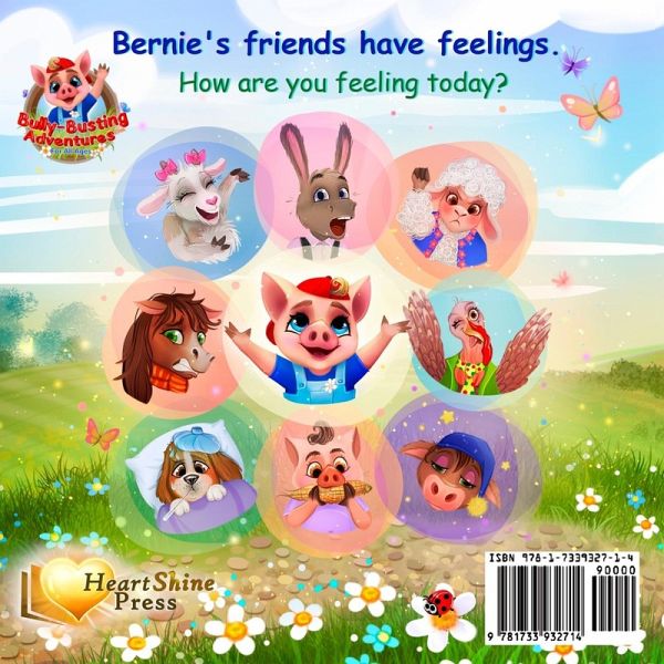 ARE YOU READY TO LEARN ABOUT FEELINGS? Sharing and caring are emphasized in this third book from Jean Voice Dart's Bully-Busting Adventures Series. Bernie, the posey-picking piglet, is having a heart-opening adventure on the farm. He invites you to join him as he meets his barnyard buddies who each share unique emotions and feelings. Bernie's friends have feelings. How are YOU feeling? THROUGH THE USE OF BRIGHT COLORFUL ILLUSTRATIONS and engaging poetic verse, readers are introduced to 10 basic colors (blue, red, yellow, green, purple, pink, orange, black, gray, and brown), 14 animal names (pig, crow, dog, sheep, cow, hen, cat, horse, donkey, turkey, duck, goat, goose, and rooster), and 16 basic feelings (happy, sick, mad, hungry, sleepy, confused, sad, scared, surprised, silly, hurt, laughing, proud, thinking, loving, and caring). At the end of Bernie's adventure, he has learned about feelings, friendship, and caring. "Then Bernie says, 'Yes! Friends have feelings to share. The love in my heart helps me listen and care. I care for my friends and I care about you. It's good to have feelings. Goodbye. Toodleloo!'" A PERCENTAGE OF PROCEEDS is donated to highly-ranked children's charities. Thank you so much for your support.