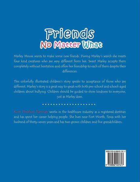 Marley Mouse wants to make some new friends. During Marley's search she meets four kind creatures who are very different from her. Sweet Marley accepts them completely without hesitation and offers her friendship to each of them despite their differences. This colorfully illustrated children's story speaks to acceptance of those who are different. Marley's story is a great way to speak with both pre-school and school-aged children about bullying. Children should be guided to show kindness to everyone, just as Marley does.