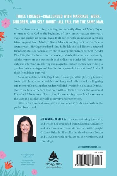 Three friends-challenged with marriage, work, children, and self-doubt-all fall for the same man. The handsome, charming, wealthy, and recently divorced Mack Taylor returns to Cape Cod at the beginning of the summer season after years away and shakes up several lives. It all begins with an innocent Facebook friend request to Sadie from Mack. Mack is coming back to the Cape to open a resort. Having once dated him, Sadie she feels she has dibs on a renewed friendship. But she soon realizes she has competition from her best friends: Charlotte, the charismatic former model, and Ada, the smart and coy beauty. All the women are at crossroads in their lives, so Mack's laid-back personality and attention is alluring and magnetic. But are they willing to gamble their marriages and families for a second chance at love? And will their friendships survive? Alexandra Slater depicts Cape Cod sensuously, and the glittering beaches, boats, golf clubs, summer soirées, and fancy cocktails make for a lingering and memorable setting that readers will find irresistible. Yet, equally relatable to readers is the fact that even with all their luxuries, the women of Friends with Boats are still searching for something more. Mack's return to the Cape is a catalyst for self-discovery and reinvention. Filled with humor, drama, sex, and romance, Friends with Boats is the perfect beach read. Alexandra Slater is an award-winning journalist and writer. She graduated from Columbia University and is a former actress and comedian with Upright Citizens Brigade. She splits her time between Boston and Cleveland with her husband, their children, and three dogs.