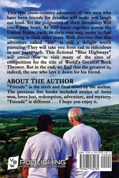 This epic cross-country adventure of two men who have been friends for decades will make you laugh out loud. Yet the poignancy of their friendship Will touch your heart. As they travel together across the United States, each, in their own way, seeks to find meaning in their older years. Both discover that this adventure called "life" is still a delight worth pursuing. They will take you from sad to ridiculous in one paragraph. This fictional "Blue Highways" Will entice you to visit many of the sites of competition for the title of World's Greatest Rock Thrower. But in the end, we find that the greatest is, indeed, the one who lays it down for his friend.