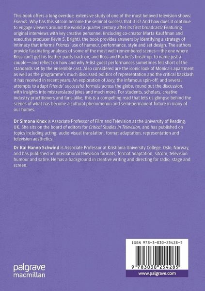 This book offers a long overdue, extensive study of one of the most beloved television shows: Friends. Why has this sitcom become the seminal success that it is? And how does it continue to engage viewers around the world a quarter century after its first broadcast? Featuring original interviews with key creative personnel (including co-creator Marta Kauffman and executive producer Kevin S. Bright), the book provides answers by identifying a strategy of intimacy that informs Friends' use of humour, performance, style and set design. The authors provide fascinating analyses of some of the most well-remembered scenes-the one where Ross can't get his leather pants back on, and Ross and Rachel's break-up, to name just a couple-and reflect on how and why A-list guest performances sometimes fell short of the standards set by the ensemble cast. Also considered are the iconic look of Monica's apartment as well as the programme's much discussed politics of representation and the critical backlash it has received in recent years. An exploration of Joey, the infamous spin-off, and several attempts to adapt Friends' successful formula across the globe, round out the discussion, with insights into mistranslated jokes and much more. For students, scholars, creative industry practitioners and fans alike, this is a compelling read that lets us glimpse behind the scenes of what has become a cultural phenomenon and semi-permanent fixture in many of our homes.