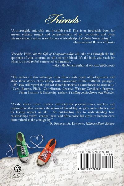 Friendships serve as a cornerstone to a rich life. Each of these twenty-four accomplished authors share authentic stories that consider the meaning of life affirming, sometimes life-saving or gut-wrenching, and fun realities of investing in each other: think Chicken Soup with adult beverages. The investment in friendship offers a reciprocal return that may support you and your friend throughout life's challenges and joys. Friends:Voices On The Gift Of Companionship presents genuine and literary accounts of shared experiences with those who energize and shape all our days. Share these stories with your friends.Celebrate and clarify the value of friendships. Honor those who have helped you through life's challenges. Acknowledge the profound value of the big friend, the one who moved through life's phases with you. Recognize the importance of the friends who have served as witness to your growth and change. Remember the friends you lost along the way but who brought you and still bring you joy. Learn the value of a friendship that changes. Accept the times no one stood with you. Consider the meaning of the memories no one ever speaks of. Navigate the mostly virtual friendships. Thank the teachers and the givers. Say good-by because it's time or because you have no other choice. Navigate relationships when paths diverge. Thank a friend, by sharing these stories. You are invited to consider, value, and celebrate the friendships of your past, present, and future. We recommend reading with a friend or book group-a great gift.