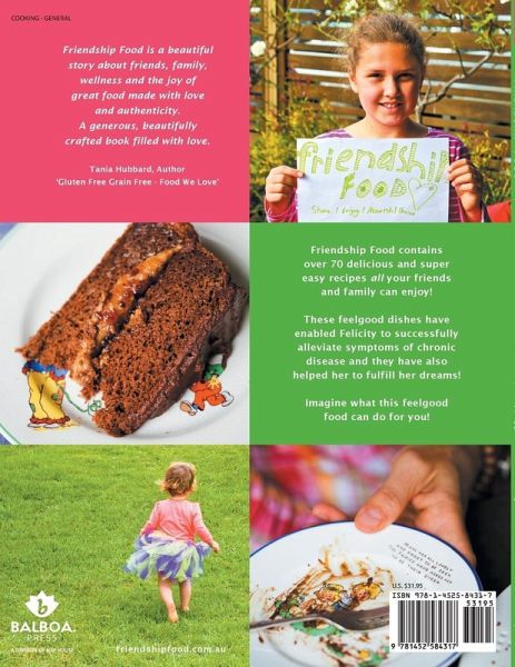 Friendship Food is a beautiful story about friends, family, wellness and the joy of great food made with love and authenticity. A generous, beautifully crafted book filled with love. - Tania Hubbard, Author 'Gluten Free Grain Free - Food We Love' Friendship Food contains over 70 delicious and super easy recipes all your friends and family can enjoy! These feelgood dishes have enabled Felicity to successfully alleviate symptoms of chronic disease and they have also helped her to fulfill her dreams! Imagine what this feelgood food can do for you!