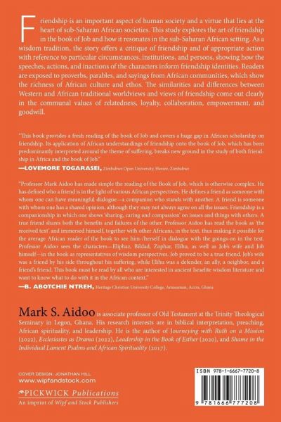 Friendship is an important aspect of human society and a virtue that lies at the heart of sub-Saharan African societies. This study explores the art of friendship in the book of Job and how it resonates in the sub-Saharan African setting. As a wisdom tradition, the story offers a critique of friendship and of appropriate action with reference to particular circumstances, institutions, and persons, showing how the speeches, actions, and inactions of the characters inform friendship identities. Readers are exposed to proverbs, parables, and sayings from African communities, which show the richness of African culture and ethos. The similarities and differences between Western and African traditional worldviews and views of friendship come out clearly in the communal values of relatedness, loyalty, collaboration, empowerment, and goodwill.