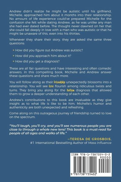 Andrew didn't realize he might be autistic until his girlfriend, Michelle, approached him about it months into their relationship. No amount of life experience could've prepared Michelle for the confusion she felt while dating Andrew, as he was unlike any man she had ever dated before. The thought never dawned on her that she could fall deeply in love with a man who was autistic or that he might be unaware of this, even into his thirties. Whenever they share their story, they are asked the same three questions: How did you figure out Andrew was autistic? How did you approach him about it? How did you get a diagnosis? These are all fair questions and have interesting and often comedic answers. In this compelling book, Michelle and Andrew answer these questions and share much more. You will follow along as their FRIENDSHIP unexpectedly blossoms into a relationship. You will see LOVE flourish among ridiculous twists and turns. They bring you along for the AUTISM diagnosis that allowed them to grow a deeper understanding of each other. Andrew's contributions to this book are invaluable as they give insight as to what life is like to be him. Michelle's humor and authenticity are both unexpected and refreshing. Come along on this outrageous journey of friendship turned to love on the spectrum. "You'll laugh, you'll cry, and you'll see numerous people you are close to through a whole new lens! This book is a must-read for people of all ages and walks of life." Teresa de Grosbois, #1 International Bestselling Author of Mass Influence