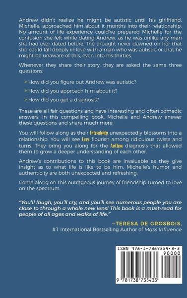 Andrew didn't realize he might be autistic until his girlfriend, Michelle, approached him about it months into their relationship. No amount of life experience could've prepared Michelle for the confusion she felt while dating Andrew, as he was unlike any man she had ever dated before. The thought never dawned on her that she could fall deeply in love with a man who was autistic or that he might be unaware of this, even into his thirties. Whenever they share their story, they are asked the same three questions: How did you figure out Andrew was autistic? How did you approach him about it? How did you get a diagnosis? These are all fair questions and have interesting and often comedic answers. In this compelling book, Michelle and Andrew answer these questions and share much more. You will follow along as their FRIENDSHIP unexpectedly blossoms into a relationship. You will see LOVE flourish among ridiculous twists and turns. They bring you along for the AUTISM diagnosis that allowed them to grow a deeper understanding of each other. Andrew's contributions to this book are invaluable as they give insight as to what life is like to be him. Michelle's humor and authenticity are both unexpected and refreshing. Come along on this outrageous journey of friendship turned to love on the spectrum. "You'll laugh, you'll cry, and you'll see numerous people you are close to through a whole new lens! This book is a must-read for people of all ages and walks of life." Teresa de Grosbois, #1 International Bestselling Author of Mass Influence