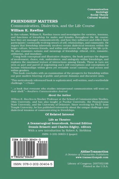 In this volume, Dr. Rawlins traces and investigates the varieties, tensions, and functions of friendship for males and females throughout the life course. Using both conceptual and illustrative chapters, the book portrays the degrees of involvement, choice, risk, ambivalence, and ambiguity within friendships, and explores the emotional texture of interactions among friends. A concluding section examines the prospects for friendship in the course of our post-modern blurring of public and private domains and discursive sites.