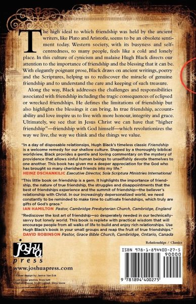 A CLASSIC GUIDE TO FINDING, RESTORING AND BUILDING LASTING FRIENDSHIPS. ? The high ideal to which friendship was held by the ancient writers, like Plato and Aristotle, seems to be an obsolete sentiment today. Western society, with its busyness and self-centredness, to many people, feels like a cold and lonely place. In this culture of cynicism and malaise Hugh Black directs our attention to the importance of friendship and the blessing that it can be. With elegantly poignant prose, Black draws on ancient writings, poetry and the Scriptures, helping us to rediscover the miracle of genuine friendship and to understand the care and keeping of such treasure. Along the way, Black addresses the challenges and responsibilities associated with friendship including the tragic consequences of eclipsed or wrecked friendships. He defines the limitations of friendship but also highlights the blessings it can bring. In true friendship, accountability and love inspire us to live with more honour, integrity and grace. Ultimately, we see that in Jesus Christ we can have that "higher friendship"-friendship with God himself-which revolutionizes the way we live, the way we think and the things we value. This classic work is an inspiring read!