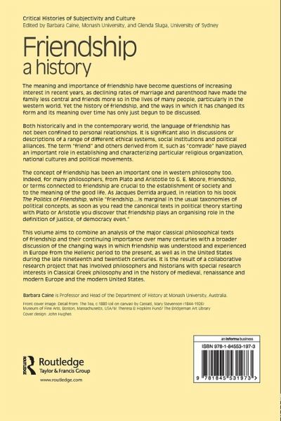 There has been an increasing interest in the meaning and importance of friendship in recent years, particularly in the West. However, the history of friendship, and the ways in which it has changed over time, have rarely been examined. Friendship: A History traces the development of friendship in Europe from the Hellenistic period to today. The book brings together a range of essays that examine the language of friendship and its significance in terms of ethics, social institutions, religious organizations and political alliances. The essays study the works of classical and contemporary authors to explore the role of friendship in Western philosophy. Ranging from renaissance friendships to Christian and secular friendships and from women's writing to the role of class and sex in friendships, Friendship: A History will be invaluable to students and scholars of social history.