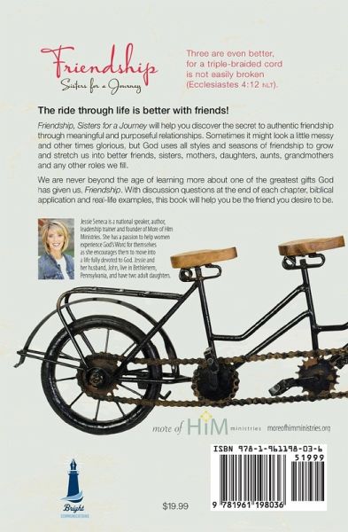 The ride through life is better with friends! Friendship, Sisters for a Journey will help you discover the secret to authentic friendship through meaningful and purposeful relationships. Sometimes it might look a little messy and other times glorious, but God uses all styles and seasons of friendships to grow and stretch us into better friends, sisters, mothers, daughters, aunts, grandmothers, and any other roles we fill.We are never beyond the age of learning more about one of the greatest gifts God has given us, Friendship.With discussion questions at the end of each chapter, biblical application, and real-life examples, this book will help you be the friend you desire to be.