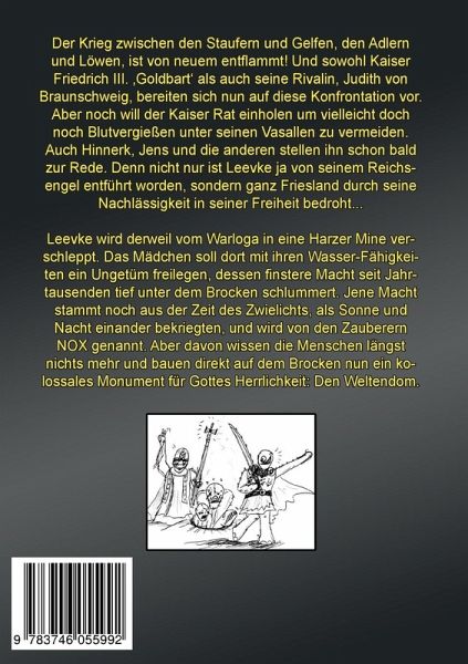 Der Krieg zwischen den Staufern und Gelfen, den Adlern und Löwen ist von neuem entflammt! Und sowohl Kaiser Friedrich III. 'Goldbart' als auch seine Rivalin, Judith von Braunschweig bereiten sich nun auf diese Konfrontation vor. Aber noch will der Kaiser Rat einholen, um vielleicht doch noch Blutvergießen unter seinen Vasallen zu vermeiden. Auch Hinnerk, Jens und die anderen stellen ihn schon bald zur Rede. Denn nicht nur ist Leevke ja von seinem Reichsengel entführt worden, sondern ganz Friesland durch seine Nachlässigkeit in seiner Freiheit bedroht ...Leevke wird derweil vom Warloga in eine Harzer Mine verschleppt. Das Mädchen soll dort mit ihren Wasser-Fähigkeiten ein Ungetüm freilegen, dessen finstere Macht seit Jahrtausenden tief unter dem Brocken schlummert. Jene Macht stammt noch aus der Zeit des Zwielichts, als Sonne und Nacht einander bekriegten, und wird von den Zauberern NOX genannt. Aber davon wissen die Menschen längst nichts mehr und bauen direkt auf dem Brocken nunein kolossales Monument für Gottes Herrlichkeit: Den Weltendom.