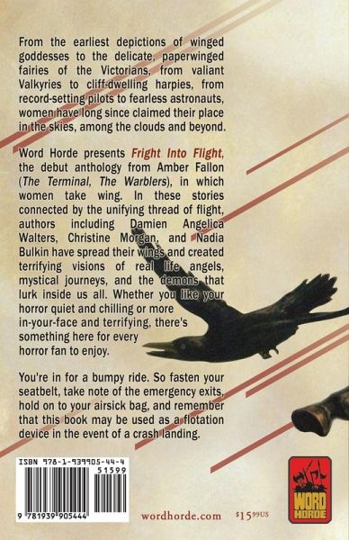 From the earliest depictions of winged goddesses to the delicate, paperwinged fairies of the Victorians, from valiant Valkyries to cliff-dwelling harpies, from record-setting pilots to fearless astronauts, women have long since claimed their place in the skies, among the clouds and beyond. Word Horde presents Fright Into Flight, the debut anthology from Amber Fallon (The Terminal, The Warblers), in which women take wing. In these stories connected by the unifying thread of flight, authors including Damien Angelica Walters, Christine Morgan, and Nadia Bulkin have spread their wings and created terrifying visions of real life angels, mystical journeys, and the demons that lurk inside us all. Whether you like your horror quiet and chilling or more in-your-face and terrifying, there's something here for every horror fan to enjoy. You're in for a bumpy ride... So fasten your seatbelt, take note of the emergency exits, hold on to your airsick bag, and remember that this book may be used as a flotation device in the event of a crash landing.
