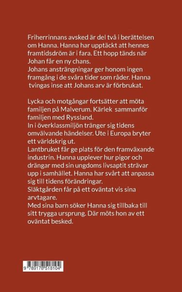 Friherrinnans avsked är del 2 i berättelsen om Hanna. Hanna har upptäckt att hennes framtidsdröm är i fara. Ett hopp tänds när Johan får en ny chans. Johans ansträngningar ger honom ingen framgång i de svåra tider som råder. Hanna tvingas inse att Johans arv är förbrukat. Lycka och motgångar fortsätter att möta familjen på Malverum. Kärlek sammanför familjen med Ryssland. In i överklassmiljön tränger tidens omvälvande händelser. Ute i Europa bryter ett världskrig ut. Lantbruket får ge plats för den framväxande industrin. Hanna upplever hur pigor och drängar med sin ungdoms livsaptit strävar upp i samhället och bort från livet på en gård. Hanna har svårt att anpassa sig till tidens förändringar. Släktgården får på ett oväntat vis sina arvtagare. När Johans svek uppenbaras bryter Hanna upp. Med sina barn söker hon sig tillbaka till sitt trygga ursprung. Där möts hon av ett oväntat besked.