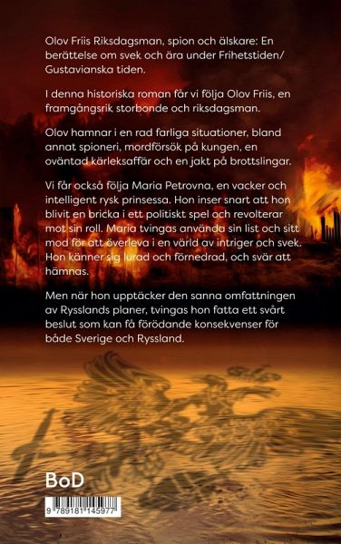 Olov Friis Riksdagsman, spion och älskare: En berättelse om svek och ära under Frihetstiden/Gustavianska tiden. I denna historiska roman får vi följa Olov Friis, en framgångsrik storbonde och riksdagsman. Olov hamnar i en rad farliga situationer, bland annat spioneri, mordförsök på kungen, en oväntad kärleksaffär och en jakt på brottslingar. Vi får också följa Maria Petrovna, en vacker och intelligent rysk prinsessa. Hon inser snart att hon blivit en bricka i ett politiskt spel och revolterar mot sin roll. Maria tvingas använda sin list och sitt mod för att överleva i en värld av intriger och svek. Hon känner sig lurad och förnedrad, och svär att hämnas. Men när hon upptäcker den sanna omfattningen av Rysslands planer, tvingas hon fatta ett svårt beslut som kan få förödande konsekvenser för både Sverige och Ryssland.