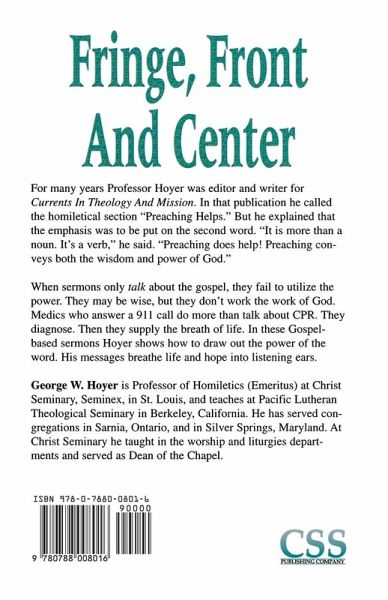 For many years Professor Hoyer was editor and writer for Currents In Theology And Mission. In that publication he called the homiletical section "Preaching Helps." But he explained that the emphasis was to be put on the second word. "It is more than a noun. It's a verb," he said. "Preaching does help! Preaching conveys both the wisdom and power of God." When sermons only talk about the gospel, they fail to utilize the power. They may be wise, but they don't work the work of God. Medics who answer a 911 call do more than talk about CPR. They diagnose. Then they supply the breath of life. In these gospel-based sermons Hoyer shows how to draw out the power of the word. His messages breathe life and hope into listening ears. George W. Hoyer is Professor of Homiletics (Emeritus) at Christ Seminary, Seminex, in St. Louis, and teaches at Pacific Lutheran Theological Seminary in Berkeley, California. He has served congregations in Sarnia, Ontario, and in Silver Springs, Maryland. At Christ Seminary he taught in the worship and liturgies departments and served as Dean of the Chapel.