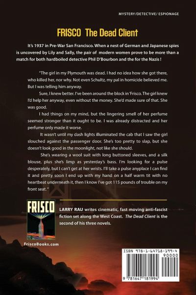 This fast-paced Noir page turner will satisfy readers dying to see strong modern women who are smart and tough enough to get the best of both Nazis and their own pet hard boiled detective. Set in the milieu of San Francisco and the Bay Area in the late 1930's, Frisco waterfront detective Phil Bourbon meets a rich new client with a wad of money who's in a lot of trouble. 60 minutes later she turns up dead in his '35 Plymouth. According to his pal Shultz, from Homicide, the hard boiled detective is a suspect until proven otherwise. At first, Phil's girlfriend Lily - the owner of a Chinatown Night Club - seems nothing more than a "deliciously wrapped chocolate". Lily is, however, anything but trivial. Set against the pre-war American back drop of loud and ubiquitous Nazi propaganda and the free circulation of fascist ideas, Phil is unwittingly thrust into a hidden world of German and Japanese espionage and murder. Sally - his mysterious client and formidable "army brat" - becomes his ally in a no holds barred fight against the Nazi spies and moles who killed her father and sister. Or is she? Together they find allies among the old Wobblies and socialist egg ranchers populating the countryside around Petaluma and Pt. Reyes, and among the fishermen of China Camp, and Italians of North Beach. Luckily Morris Shultz believes their incredible story. As the Germans and Japanese pursue Phil and Sally, the tables are turned. Surprised spies find themselves being hunted and killed while most Americans, official and otherwise, seem to be sleep walking. Can this pair "running wild" - shooting up small towns with a piper cub and a tommy-gun - stop the Nazis before they get their stolen secrets out of the country? Can Sally and Phil convince the Army and FBI that they are the good guys, despite a trail of explosions and dead Germans who had diplomatic immunity? And Where does Lily fit into all this? A fancy Packard is waiting. Fog horns are moaning. Cathedral Bells are chiming. The cannery gals are sharpening their knives down on the docks. Odd radio signals are coming from a cottage up on the hill. Read on and find out! _____________________________ While this is fast paced cinematic pulp, keen readers will rejoice in its historical and geographic accuracy, and perhaps in its thoroughly patriotic left wing tone, and spare but colorful style. You can learn more about the making of this book on the FriscoBooks website.