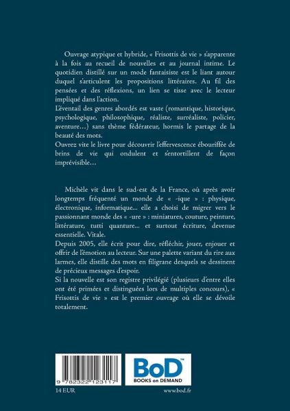 Ouvrage atypique et hybride, " Frisottis de vie " s'apparente à la fois au recueil de nouvelles et au journal intime. Le quotidien distillé sur un mode fantaisiste est le liant autour duquel s'articulent les propositions littéraires. Au fil des pensées et des réflexions, un lien se tisse avec le lecteur impliqué dans l'action. L'éventail des genres abordés est vaste (romantique, historique, psychologique, philosophique, réaliste, surréaliste, policier, aventure...) sans thème fédérateur, hormis le partage de la beauté des mots. Ouvrez vite le livre pour découvrir l'effervescence ébouriffée de brins de vie qui ondulent et s'entortillent de façon imprévisible...