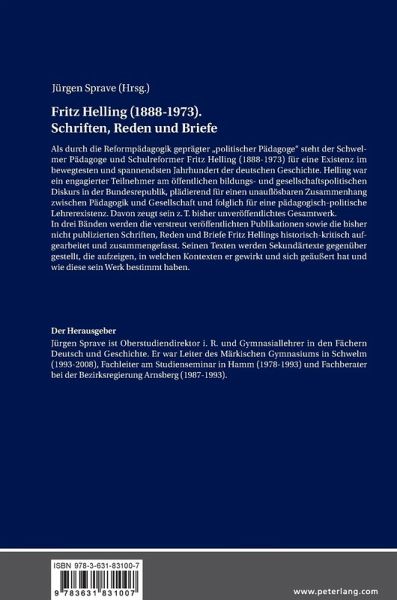 Als durch die Reformpädagogik geprägter «politischer Pädagoge» steht der Schwelmer Pädagoge und Schulreformer Fritz Helling (1888-1973) für eine Existenz im bewegtesten und spannendsten Jahrhundert der deutschen Geschichte. Helling war ein engagierter Teilnehmer am öffentlichen bildungs- und gesellschaftspolitischen Diskurs in der Bundesrepublik, plädierend für einen unauflösbaren Zusammenhang zwischen Pädagogik und Gesellschaft und folglich für eine pädagogisch-politische Lehrerexistenz. Davon zeugt sein z. T. bisher unveröffentlichtes Gesamtwerk.