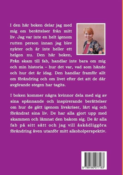 Från skam till fab - en bok om livsavgörande förändring. Boken beskriver Ulrikas förändringsresa, från fylla och ångest till nykter och trygg - älskad. Det hände inte över en natt och var inte heller något som hon gjorde på egen hand. Ja, att sluta dricka - att inte börja dricka igen är ett eget ansvar men för att kunna leva nyktert behövs hjälp från andra. Gemenskap, verktyg och hopp. För att ha fokus på förändring har Ulrika bjudit in flera kvinnor som berättat om deras kriser, uppbrott, sjukdomar - och hur de nu äger sina liv och tagit makt över sin historia. Den här boken är skriven för dig som vill få inspiration till att förändra ditt liv, att sluta med något du inte mår bra av eller är medberoende till någon som lever ett destruktivt liv. Du kan göra det, du kan också gå från skam till fab!