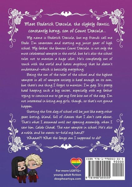My name is Froderick Dracula, but my friends call me Frode. I'm seventeen and starting my junior year of high school. My father, the famous Count Dracula, is not only the most celebrated vampire in the world, but he's also the school ruler, not to mention a huge idiot. He's completely out of touch with the world and hates anything that he doesn't understand-which is basically everything. Being the son of the ruler of the school and the highest vampire in all of vampire society is hard enough on its own, but there's one thing I forgot to mention: I'm gay. It's pretty hard keeping such a big secret, especially with my father trying to convince me to get my first bite out of the way. I'm not interested in biting any girls, though, so that's not gonna happen. Starting the first day of school will be just like every other year, boring, bland, full of classes that I don't care about. That's what I assumed until our opening assembly, when I saw him. Caleb Cheval. The new vampire in school. He's also a noble, and he wants to-hold my hand? Whaaat?! What the fangs am I supposed to do?