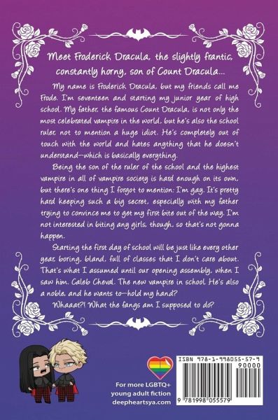My name is Froderick Dracula, but my friends call me Frode. I'm seventeen and starting my junior year of high school. My father, the famous Count Dracula, is not only the most celebrated vampire in the world, but he's also the school ruler, not to mention a huge idiot. He's completely out of touch with the world and hates anything that he doesn't understand-which is basically everything. Being the son of the ruler of the school and the highest vampire in all of vampire society is hard enough on its own, but there's one thing I forgot to mention: I'm gay. It's pretty hard keeping such a big secret, especially with my father trying to convince me to get my first bite out of the way. I'm not interested in biting any girls, though, so that's not gonna happen. Starting the first day of school will be just like every other year, boring, bland, full of classes that I don't care about. That's what I assumed until our opening assembly, when I saw him. Caleb Cheval. The new vampire in school. He's also a noble, and he wants to-hold my hand? Whaaat?! What the fangs am I supposed to do?