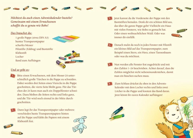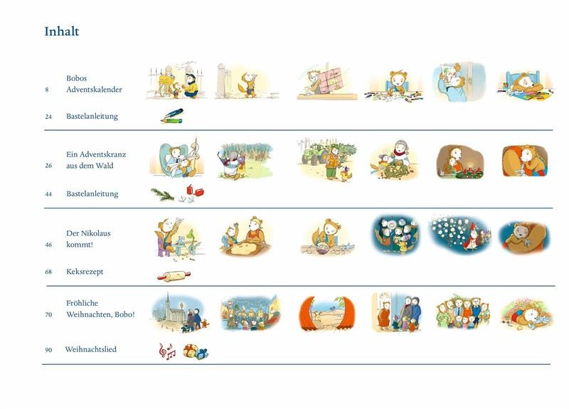 Humorvoll und kindgerecht werden vier Geschichten erzählt bei denen der Leser gemeinsam mit Bobo die Adventszeit erlebt. Alltägliches wird in kurzen Sätzen und mit wenigen Worten geschildert.