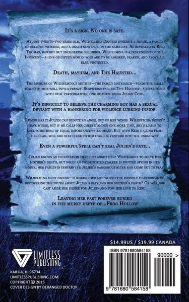 It's a sign. No one is safe. At just twenty-two years old, Wilhelmina Daniels inherits a house, a family of eclectic witches, and a death sentence on the same day. As revealed by Reid Thomas, her shy but smoldering neighbor, Wilhelmina is a descendent of the Innocent-a line of gifted women who are to be admired, feared, and above all else, protected. Death, mayhem, and The Haunted... The murder of Wilhelmina's mother-the family matriarch-sends the small town's rumor-mill into a frenzy. Suspicions fall on The Haunted, a rival force with dual personalities, one of them being Julien Cote. It's difficult to believe the charming boy has a sexual deviant with a hankering for violence lurking inside. Rumor has it Julien can seduce an angel out of her wings. Wilhelmina doesn't have wings, but if he calls her cheri d'amour one more time, she's liable to lose something of equal importance-her heart. But with Reid hailing from her clan, will she stay close to her own, or venture into the unknown? Even a powerful spell can't seal Julien's fate... Julien knows an incantation that just might help Wilhelmina to solve her mother's death, but when an unidentified stalker is spotted spying in her house, her family is certain it's Julien's dangerous alter ego come out to play. Wilhelmina must decide-is risking her life worth the possible heartbreak of discovering the truth about Julien's fate and her mother's death? Or will she cast aside her desire for Julien and vow her love to Reid. Leaving her past forever buried in the murky depth of...Frog Hollow