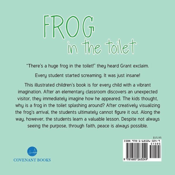 "There's a huge frog in the toilet!" they heard Grant exclaim. Every student started screaming. It was just insane! This illustrated children's book is for every child with a vibrant imagination. After an elementary classroom discovers an unexpected visitor, they immediately imagine how he appeared. The kids thought, why is a frog in the toilet splashing around? After creatively visualizing the frog's arrival, the students ultimately cannot figure it out. Along the way, however, the students learn a valuable lesson. Despite not always seeing the purpose, through faith, peace is always possible.