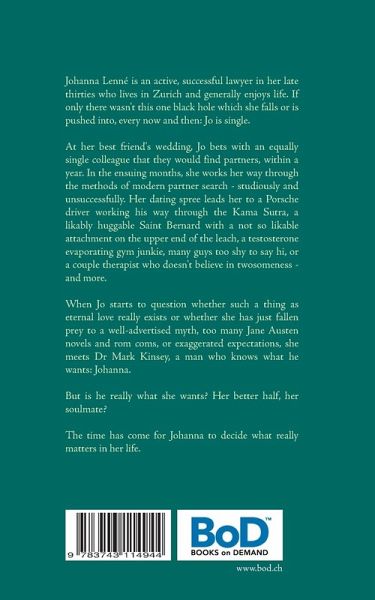Johanna Lenné is an active, successful lawyer in her late thirties who lives in Zurich and generally enjoys life: Hiking with friends, singing in a choir, taking long bike rides, traveling, and work. Life could be quite perfect if there wasn't this one black hole which she falls or is pushed into, every now and then: Jo is single. Her best friend Klara's wedding is, naturally, another occasion for a free fall into the black hole, and Jo bets with an equally single colleague that they would find partners, within a year. In the ensuing months, she works her way through the methods of modern partner search - studiously and unsuccessfully: Speed flirting, dating websites, clubs, visits at concerts or museums, old-fashioned set-ups by friends. Her dating spree leads her to a Porsche driver working his way through the Kama Sutra, a likably huggable Saint Bernard with a not so likable attachment on the upper end of the leach, a testosterone evaporating gym junkie, many guys too shy to say hi, or a couple therapist who doesn't believe in twosomeness - and more.When she increasingly questions whether there really is such a thing as eternal love or whether she has just fallen prey to a well-advertised myth, too many Jane Austen novels and rom coms, or exaggerated expectations, she meets Dr Mark Kinsey, a man who knows what he wants: Johanna. But is he really what she wants? Her better half? Her soulmate?The time has come for Johanna to decide what really matters in her life.