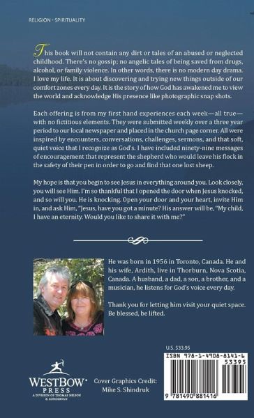 This book will not contain any dirt or tales of an abused or neglected childhood. There’s no gossip; no angelic tales of being saved from drugs, alcohol, or family violence. In other words, there is no modern day drama. I love my life. It is about discovering and trying new things outside of our comfort zones every day. It is the story of how God has awakened me to view the world and acknowledge His presence like photographic snap shots. Each offering is from my first hand experiences each week—all true—with no fictitious elements. They were submitted weekly over a three year period to our local newspaper and placed in the church page corner. All were inspired by encounters, conversations, challenges, sermons, and that soft, quiet voice that I recognize as God’s. I have included ninety-nine messages of encouragement that represent the shepherd who would leave his flock in the safety of their pen in order to go and find that one lost sheep. My hope is that you begin to see Jesus in everything around you. Look closely, you will see Him. I’m so thankful that I opened the door when Jesus knocked, and so will you. He is knocking. Open your door and your heart, invite Him in, and ask Him, "Jesus, have you got a minute? His answer will be, "My child, I have an eternity. Would you like to share it with me?"