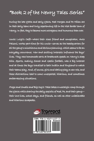 During the late 1950s and early 1960s, Red Morgan and Po Hillen are in their early teens and truly experiencing life in the Irish border town of Newry. In fact, they've become more outrageous and humorous than ever. Uncle Luigi's Café-where their close friend and conspirator, Anto Falsoni, works part-time for his uncle-serves as the headquarters for all the gang's mischievous and devious planning, which seems to be an everyday occurrence. New and exciting interests influence the boys' lives. They race homemade carts at breakneck speeds on Newry's steep hills. They avidly follow their football team and travel to Dublin and England to watch the competition. And, of course, girls and dating play a new role, and these distractions lead to some unexpected, hilarious, and sometimes embarrassing situations. Frogs and Snails and Big Dog's Tales takes a nostalgic romp through the 1960s while sharing the daily exploits of Red, Po, and their gang-their love lives, school days, and friends, as well as other unbelievable and hilarious escapades.