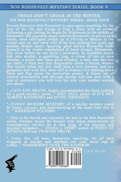 Private Detective Bob Roosevelt is once again searching for the love of his life and trying to find a place with no crime. Following a gut feeling he heads for Minnesota in the middle of December. His guardian angel informs Roosevelt, in not so nice words, most intelligent people go to Florida or Mexico in the winter and ice and snow will bring him nothing but grief and another broken heart. Ignoring good advice Roosevelt finds himself in the winter wonderland of Saint Ansgar, Minnesota. But, even before he can build a snowman, he stumbles smack dab into murder, a gambling ring, a coven of not so nice witches, a priest who likes good whiskey, a lady who has lost her heart, a little boy that desperately needs a friend, women that would rather see him dead than a love interest, and two gangsters that wish they were still in Kansas City shaking down Mom and Pop stores for protection money. A funny out of control snowmobile ride through murder and lost love with a cast of characters you will love but who your mother warned you about.