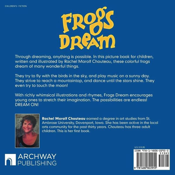 Through dreaming, anything is possible. In this picture book for children, written and illustrated by Rachel Marolf Chouteau, these colorful frogs dream of many wonderful things. They try to fly with the birds in the sky, and play music on a sunny day. They strive to reach a mountaintop, and dance until the stars shine. They even try to touch the moon! With richly whimsical illustrations and rhymes, Frogs Dream encourages young ones to stretch their imagination. The possibilities are endless! DREAM ON!