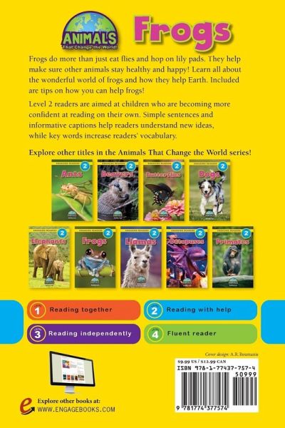 Frogs do more than just eat flies and hop on lily pads. They help make sure other animals stay healthy and happy! Learn all about the wonderful world of frogs and how they help Earth. Included are tips on how you can help frogs! Level 2 readers are aimed at children who are becoming more confident at reading on their own. Simple sentences and informative captions help readers understand new ideas, while key words increase readers' vocabulary.