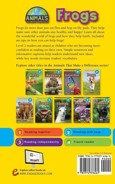 Frogs do more than just eat flies and hop on lily pads. They help make sure other animals stay healthy and happy! Learn all about the wonderful world of frogs and how they help Earth. Included are tips on how you can help frogs! Level 2 readers are aimed at children who are becoming more confident at reading on their own. Simple sentences and informative captions help readers understand new ideas, while key words increase readers' vocabulary.